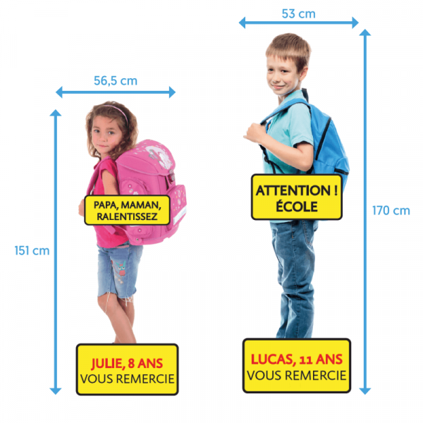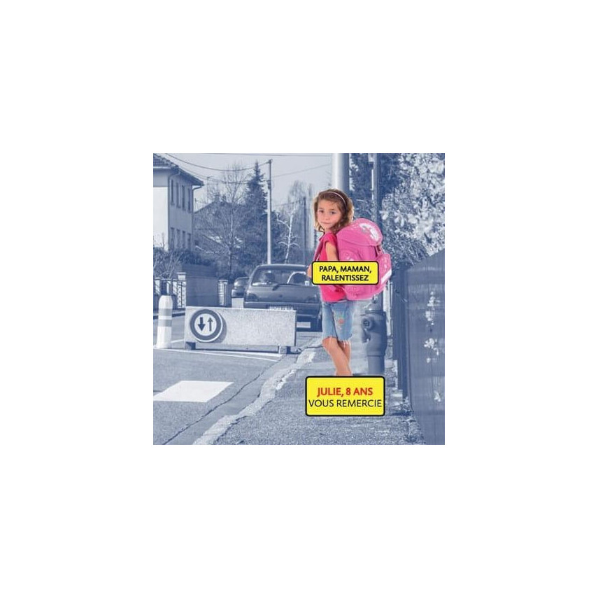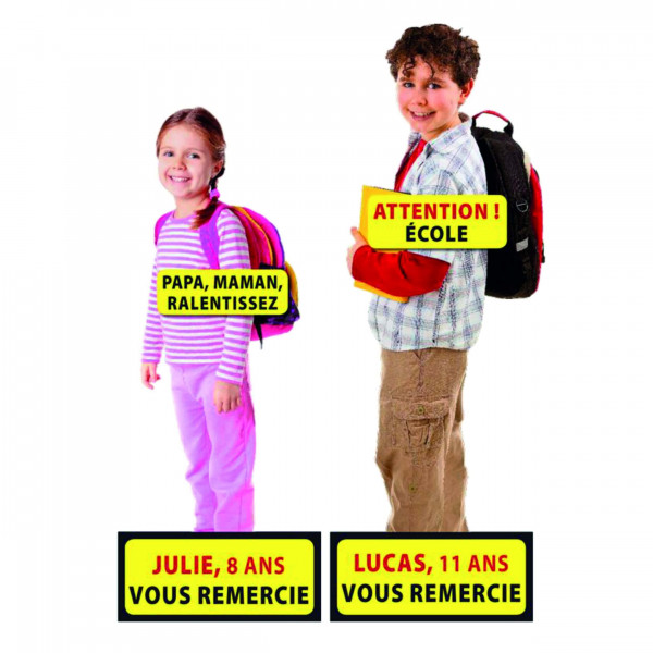 Die sehr realistischen Silhouetten stellen Kinder dar, die sich am Straßenrand aufhalten. Mit dem 11-jährigen Lucas und der 8-jährigen Julie appellieren diese Schilder an den Bürgersinn der Verkehrsteilnehmer und ermuntern Autofahrer, langsamer zu fahren.