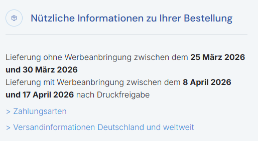 Auf jedem Produktblatt finden Sie die voraussichtlichen Lieferzeiten für die jeweilige Artikelnummer. Diese variieren je nach den von Ihnen ausgewählten Optionen. Diese Lieferzeiten sind Richtwerte und werden so weit wie möglich eingehalten. Eventuelle Verzögerungen können in keinem Fall eine Stornierung der Bestellung rechtfertigen oder zu einer Entschädigung führen.