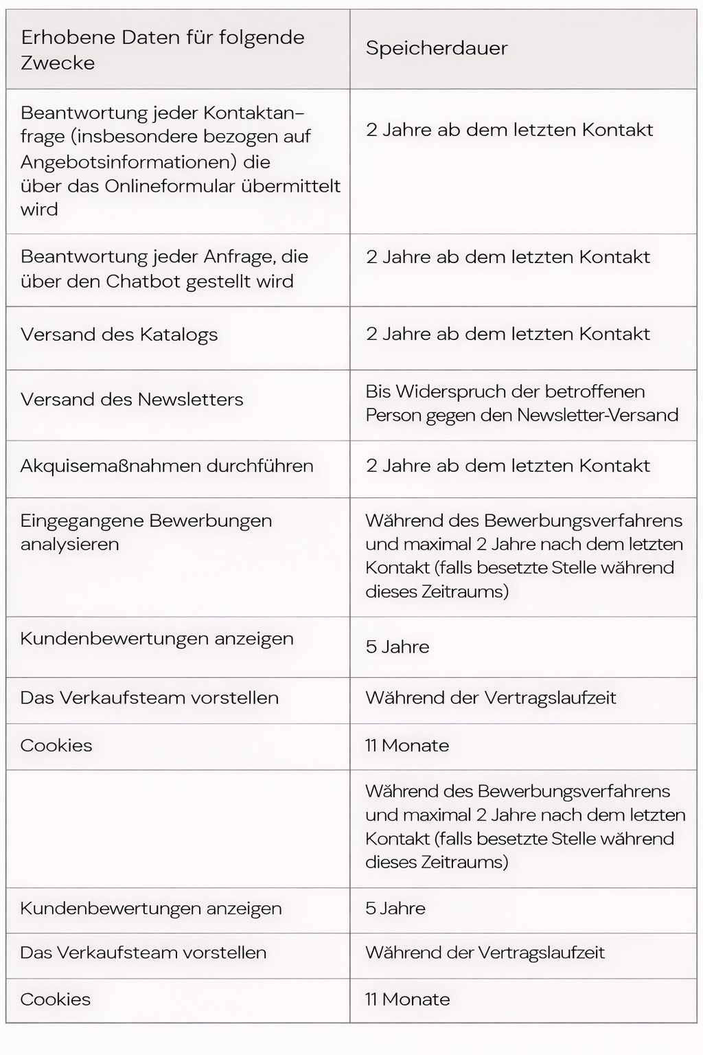 Die Daten werden während der gesetzlichen Verjährungsfristen gespeichert, insbesondere :