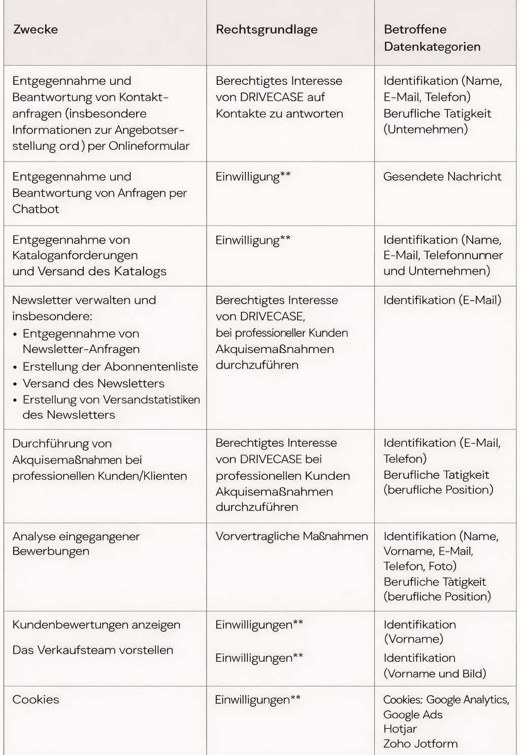 Bei begründeten Zweifeln an der Identität der betroffenen Person kann DRIVECASE die Vorlage eines Ausweises verlangen, um die genaue Identität der Person, die einen Antrag stellt, zu überprüfen und die Weitergabe von Daten an unberechtigte Dritte zu verhindern.
