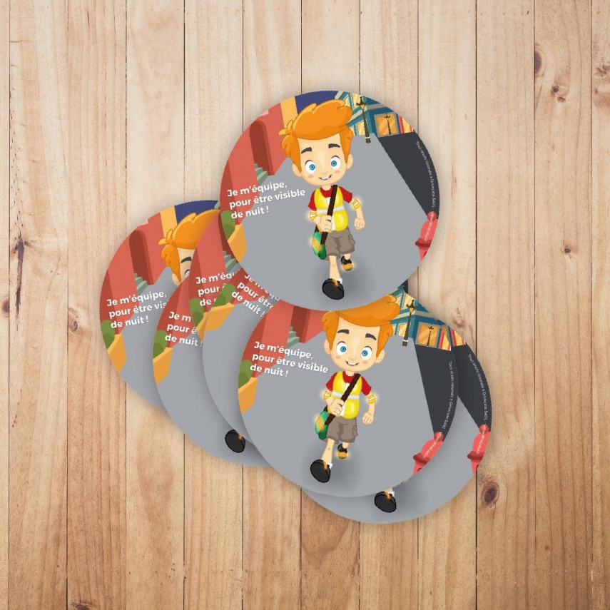 Der Aufkleber Théo „Ich rüste mich aus, um nachts sichtbar zu sein” ist ein kleines, einfaches und kostengünstiges Präventionsmittel, auf dem Théo als Fußgänger bei Nacht zu sehen ist.