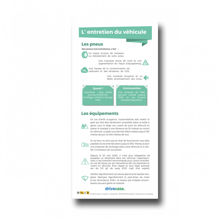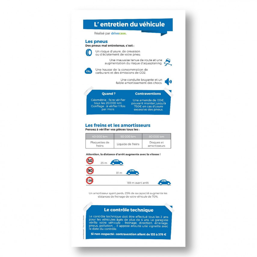 Dieser Flyer zur Sensibilisierung – Fahrzeugwartung wird in Frankreich hergestellt. Dieses Kommunikationsmittel ist sehr wirkungsvoll und wird Ihnen bei Firmen- oder Vereinsveranstaltungen sehr nützlich sein, um die Öffentlichkeit für die Verkehrssicherheit zu sensibilisieren.