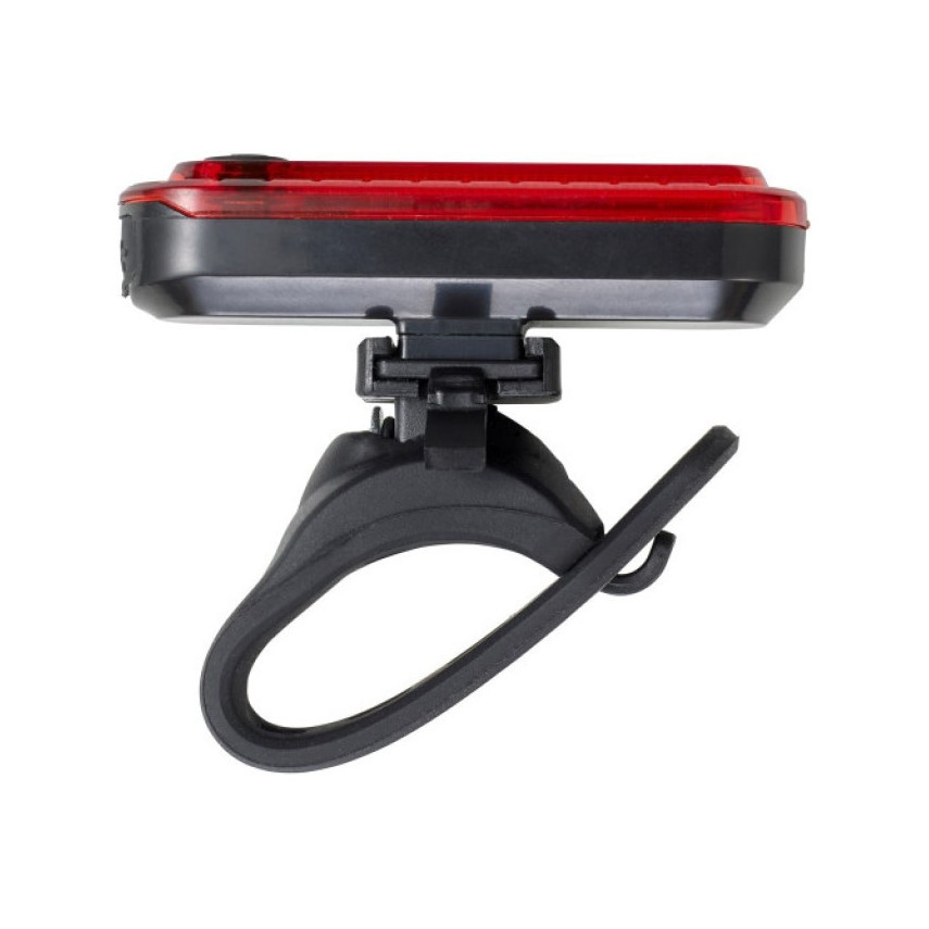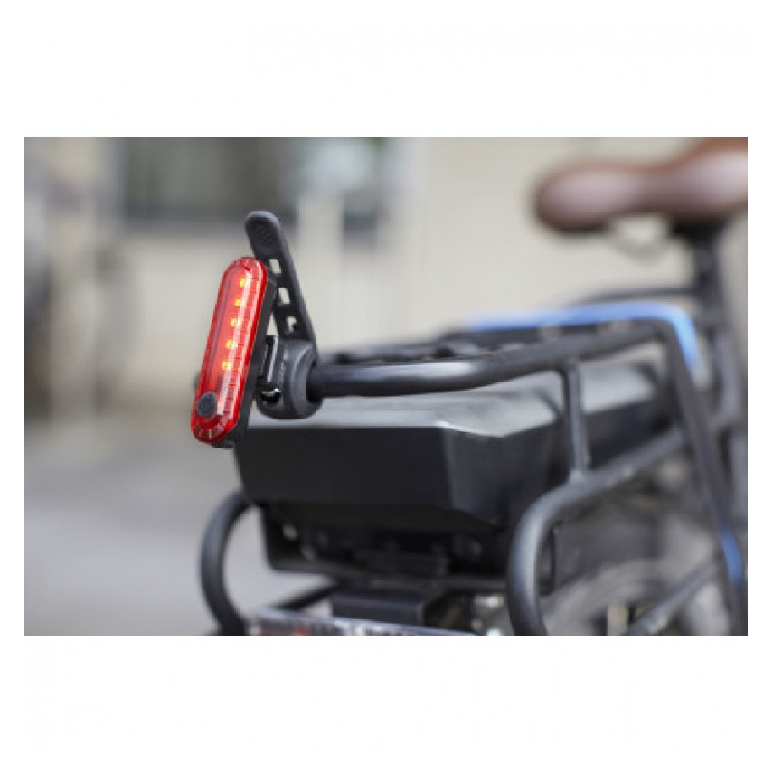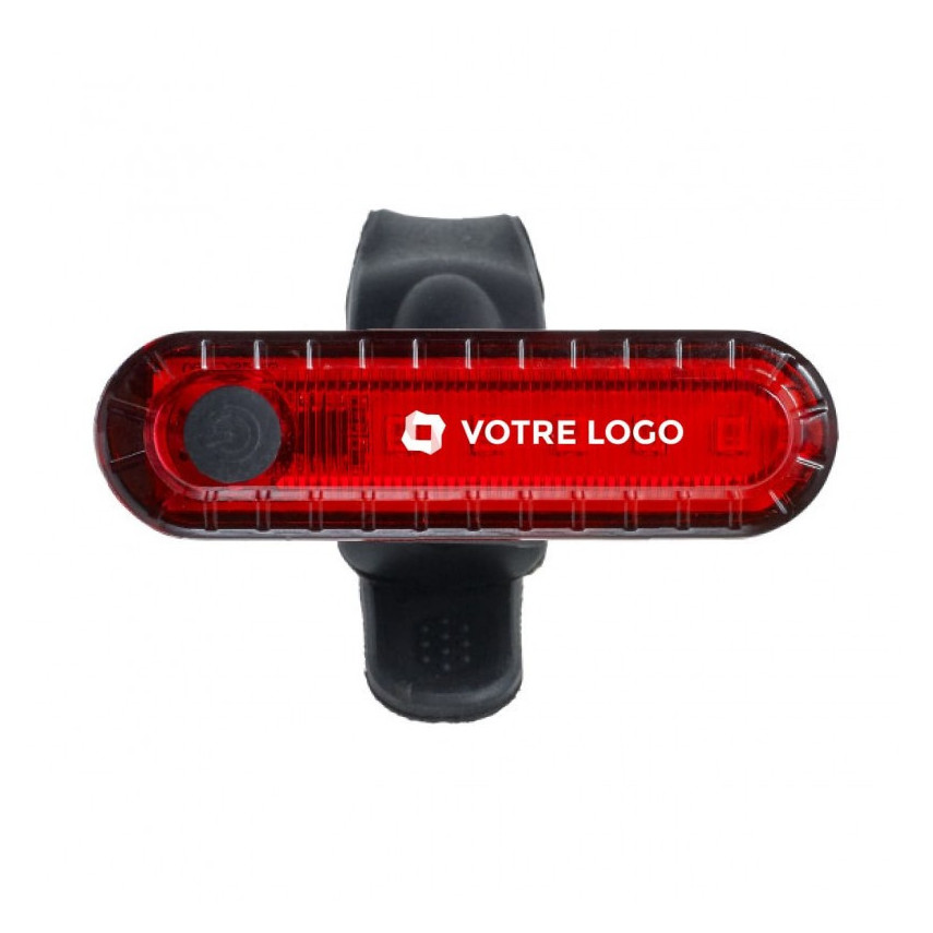 Wiederaufladbare Fahrradlampe mit Personalisierung mit Ladekabel und 4 Leuchtfunktionen. Sie wird hinten am Fahrrad am Gepäckträger oder unter dem Sattel befestigt. An Ihr Markenimage anpassbar.