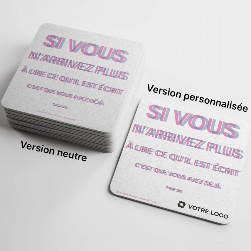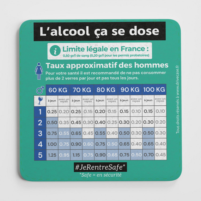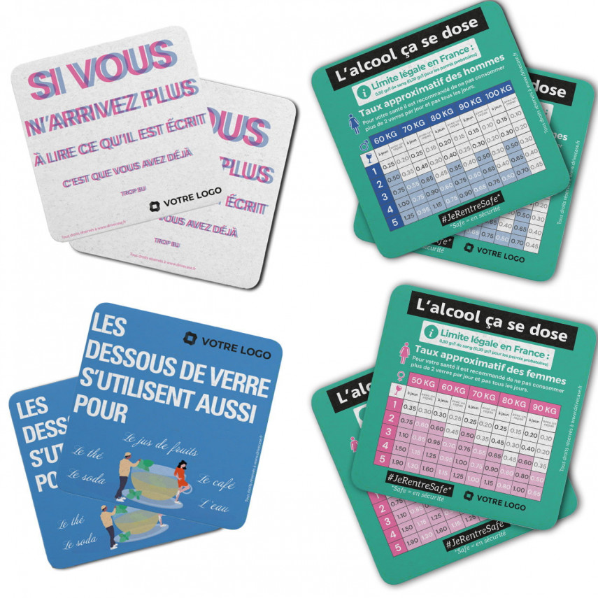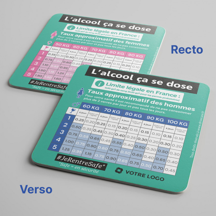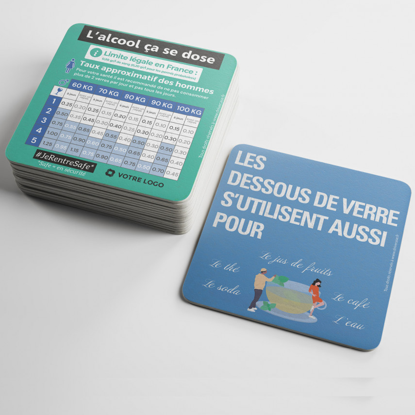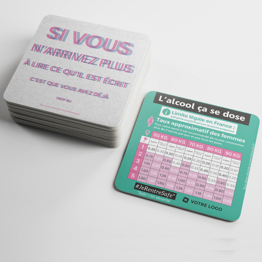 Sie fragen sich, wie Sie Ihre Mitarbeiter oder potenziellen Kunden für das Thema Alkohol sensibilisieren können? Bringen Sie eine Präventionsbotschaft direkt am Ort des Konsums vermitteln, dank der Untersetzer zur Alkoholprävention. Die Präventionsuntersetzer sind unverzichtbare Gegenstände in Restaurants, Bars und Brasserien. Sensibilisieren Sie mit starken und innovativen Botschaften, die aufschlussreich und eindeutig sind. Diese doppelseitigen Untersetzer sensibilisieren für die Gefahren des Alkohols im Straßenverkehr . Die präventiven Untersetzer können mit Ihrem Firmenlogo personalisiert werden.