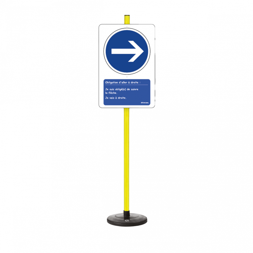Bitte beachten Sie, dass jedes Element des Lehrschilds „Rechtsabbiegen vorgeschrieben” in zwei separaten Teilen geliefert wird: zum einen die Markierung mit ihrem beschwerten Fuß und zum anderen alle anderen Elemente.