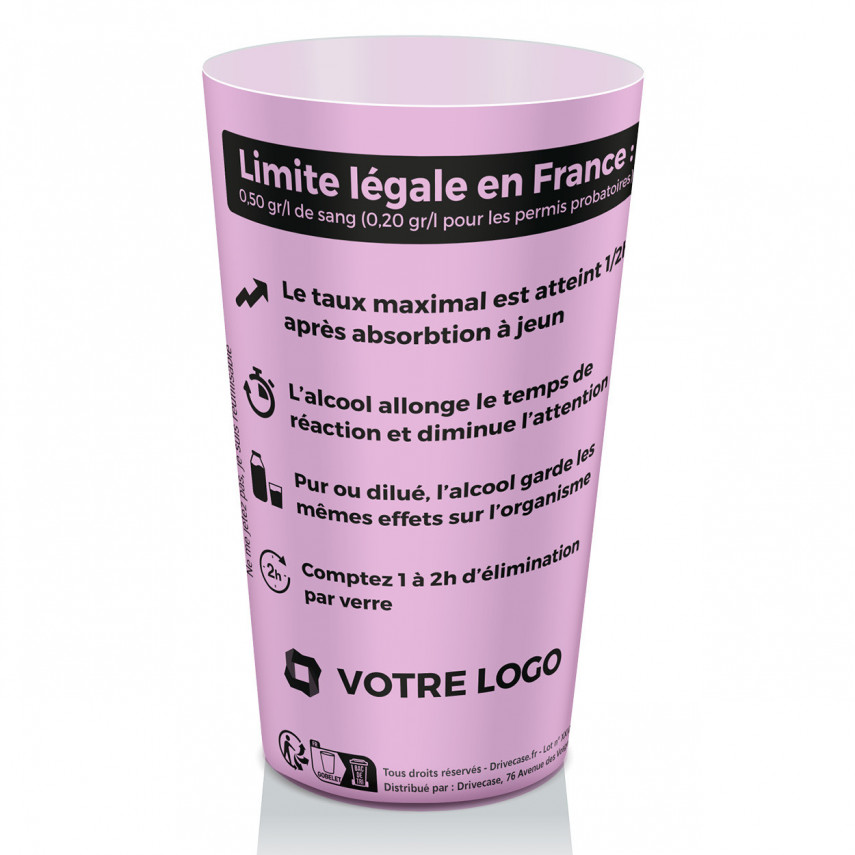 Der personalisierte rosa Alkoholpräventionsbecher ist eine kostengünstige Alternative zum personalisierten Vierfarbdruck-Becher. Der Messbecher von Drivecase besteht aus dem gleichen Material (recycelbares und wiederverwendbares Polypropylen) und ist mit Präventionsbotschaften und nützlichen Informationen zum Alkoholkonsum