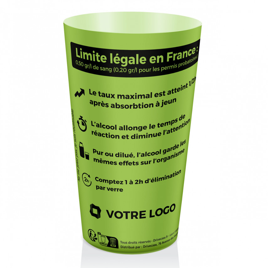 Der personalisierte Becher zur Alkoholprävention ist eine kostengünstige Alternative zum personalisierten Vierfarbdruck-Becher. Der aus dem gleichen Material (recycelbares und wiederverwendbares Polypropylen) hergestellte Alkohol-Messbecher von Drivecase mit Präventionsbotschaften, um die Verbraucher abzuschrecken, sowie mit nützlichen Informationen zum Alkoholkonsum (Aufnahmezeit, Abbauzeit usw.). Unser Becher kann bei Veranstaltungen wie auch in Bars verwendet werden, in denen Alkohol bevorzugt konsumiert wird.