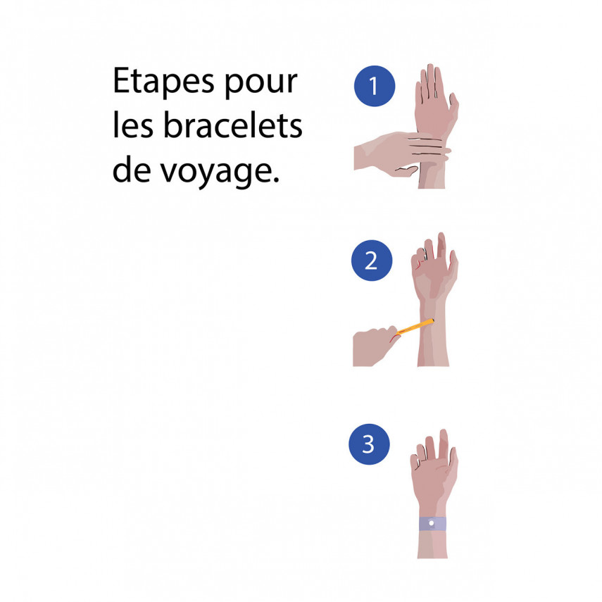 Die Reisearmbänder aus dem Erste-Hilfe-Set für Kinder sind Bänder zur Linderung von Übelkeit. Diese Bänder üben mithilfe eines Kunststoffstifts Druck auf einen Akupunkturpunkt an jedem Handgelenk aus. Dadurch wird das Gleichgewicht im Körper wiederhergestellt. Damit dies wirksam ist, müssen beide Armbänder verwendet werden.