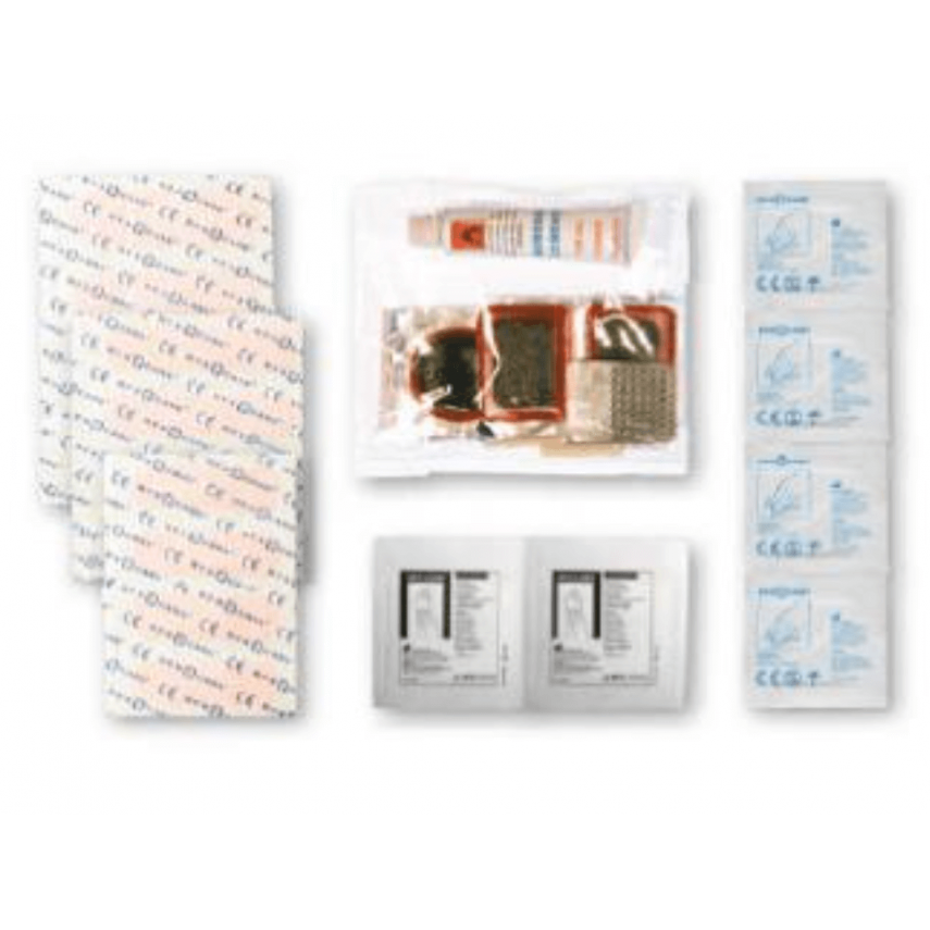 Der Inhalt umfasst das Nötigste für ein Erste-Hilfe-Set für Fahrräder :