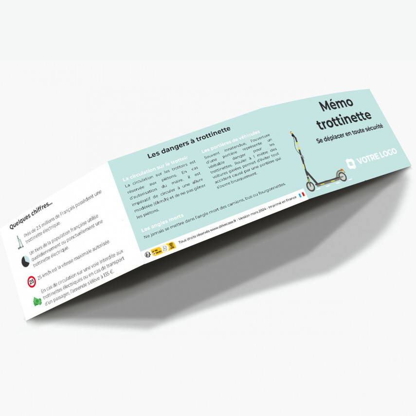 Sie haben die Möglichkeit, dieses E-Scooter-Memo mit dem Logo Ihres Unternehmens oder Ihrer Organisation zu personalisieren. Dadurch wird es zu einem wirksamen Kommunikationsmittel für Ihre Präventionsbotschaft und verstärkt die Wirkung Ihres Sensibilisierungsprogramms.