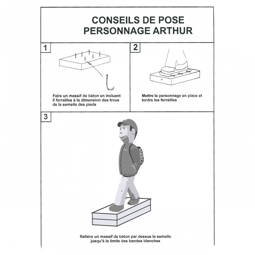 Diese Signalfiguren werden aus Verbundwerkstoffen hergestellt, die widerstandsfähig (auch gegen UV-Strahlung) und leicht sind. Die Figur hat eine Lebensdauer von 10 bis 15 Jahren. Alle 3 Jahre kann eine Politur aufgetragen werden, um die Farben aufzufrischen. Diese Verkehrszeichenfiguren sind bereits in mehr als 150 Gemeinden in Frankreich und Belgien installiert.