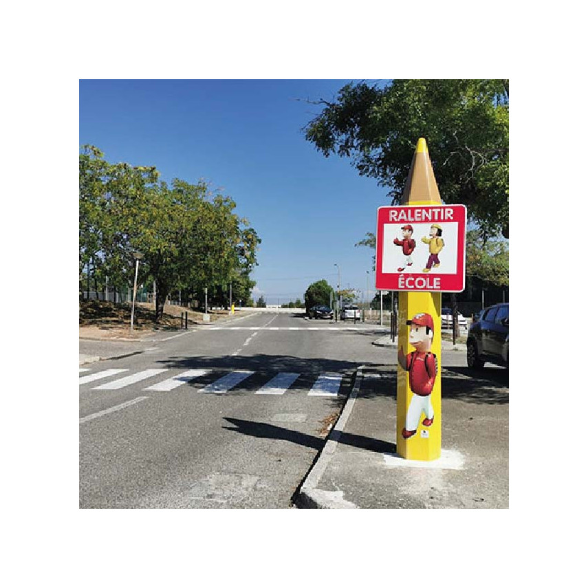 Dank seiner Höhe von 3 Metern, seinen leuchtenden Farben und seinen retroreflektierenden Buchstaben ist es Tag und Nacht gut sichtbar. Es sorgt dafür, dass Fußgängerüberwege, Geschwindigkeitsbegrenzungen und Verkehrszeichen aller Art deutlich gekennzeichnet sind. Eine gute Möglichkeit, um sicherzustellen, dass Kinder beim Überqueren der Straße gesehen werden und so Unfälle vermieden werden.