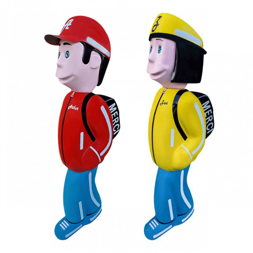 Dieses Paket mit Verkehrszeichen-Figuren besteht aus Verbundwerkstoffen, die widerstandsfähig (auch gegen UV-Strahlung) und leicht sind. Die beiden Figuren haben eine Lebensdauer von 10 bis 15 Jahren. Alle 3 Jahre kann eine Politur aufgetragen werden, um die Farben aufzufrischen. Diese Verkehrszeichenfiguren sind bereits in mehr als 150 Gemeinden in Frankreich und Belgien installiert.