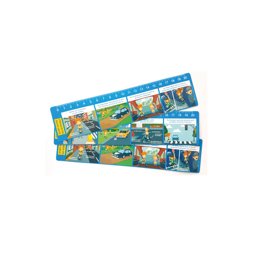 Unser in Europa hergestelltes Lineal ist flexibel und widerstandsfähig, sodass man es überallhin mitnehmen kann, ohne dass es kaputtgeht. Es handelt sich um ein pädagogisches und wirtschaftliches Produkt, um Kinder an die Herausforderungen der Verkehrssicherheit heranzuführen!
