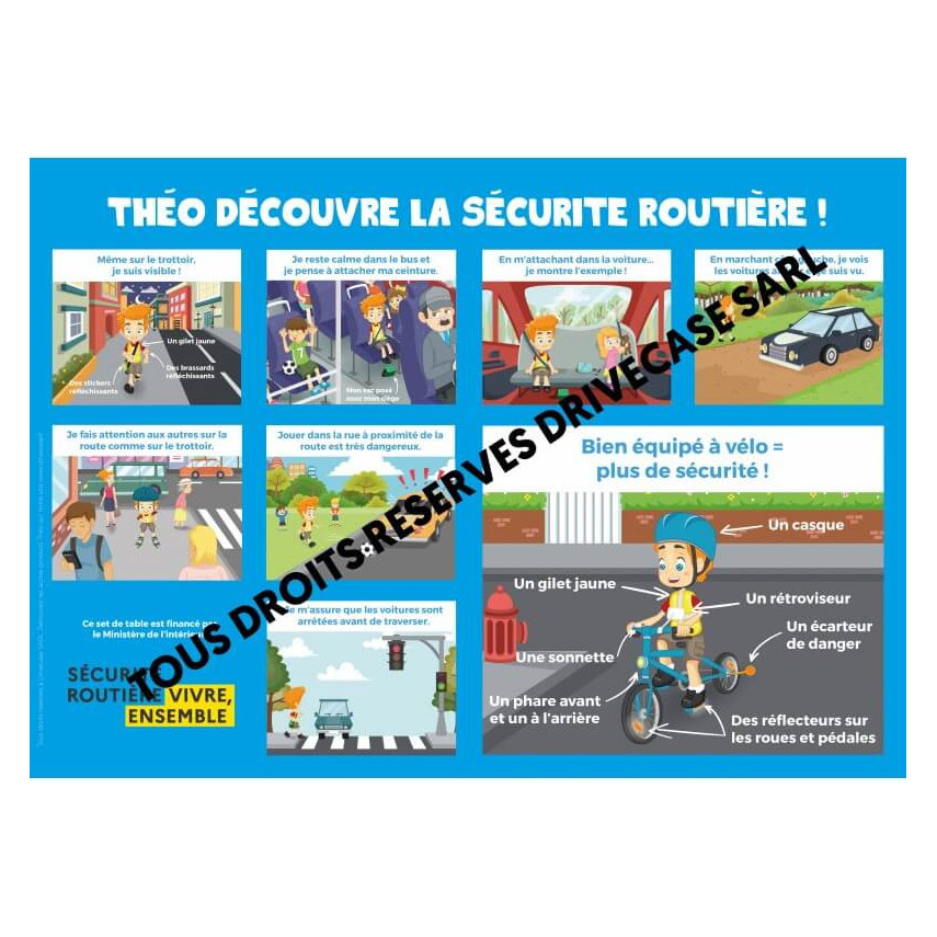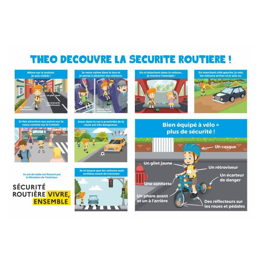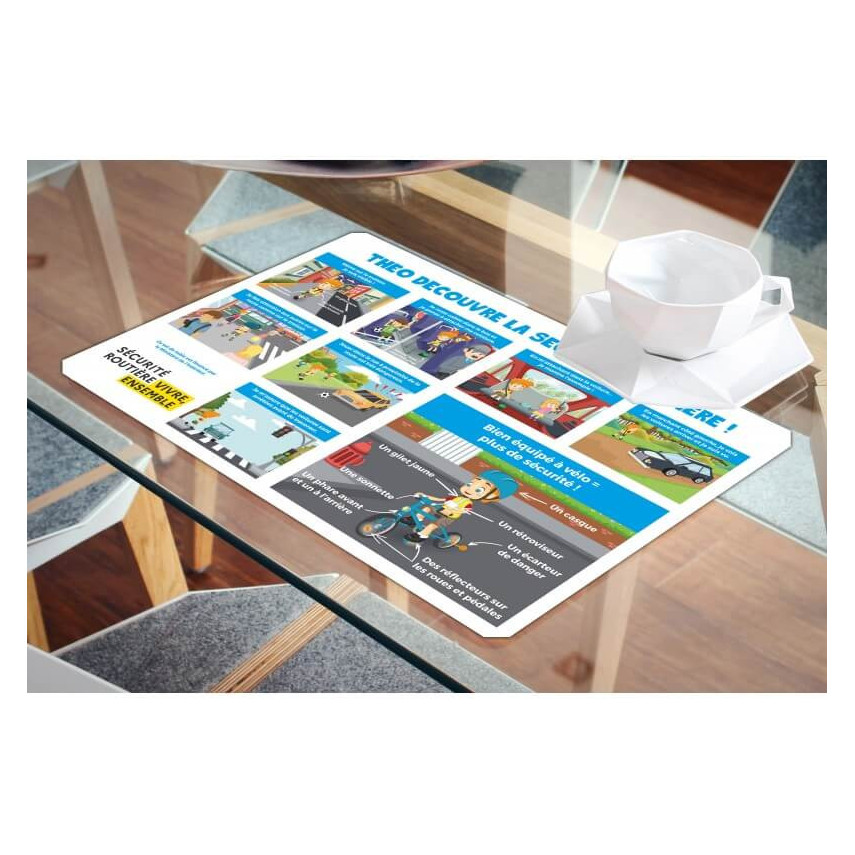 Dieses pädagogische Einweg-Tischset wird in Frankreich gedruckt , auf 90 g Papier mit dem Logo Sécurité Routière, Vivre, Ensemble. Ein spielerisches und kostengünstiges Produkt, um Kinder für die Verkehrssicherheit zu sensibilisieren!