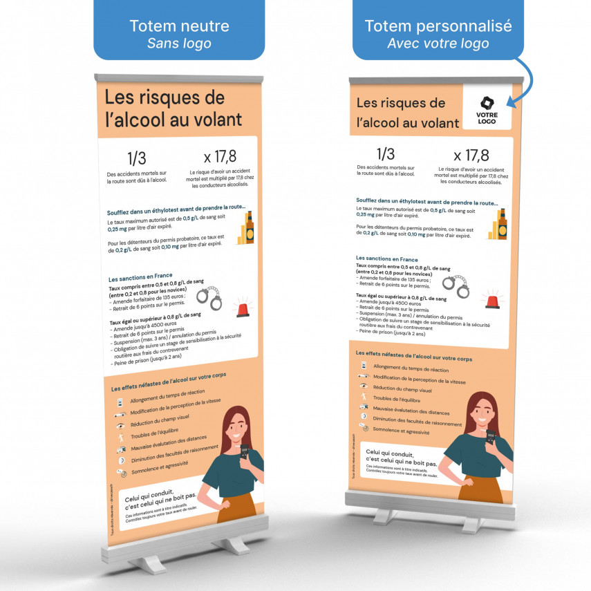 Das Totem auf die Risiken des Alkohols am Steuer lieferte konkrete Informationen über die Risiken des Fahrens unter Alkoholeinfluss. Hier finden Sie Hinweise zu den schädlichen Auswirkungen von Alkohol auf den menschlichen Körper, Statistiken sowie die in Frankreich geltenden Strafen bei Alkohol am Steuer . Es ist das ideale Werkzeug, um Ihre Botschaft zur Sensibilisierung der Öffentlichkeit zu unterstützen.
