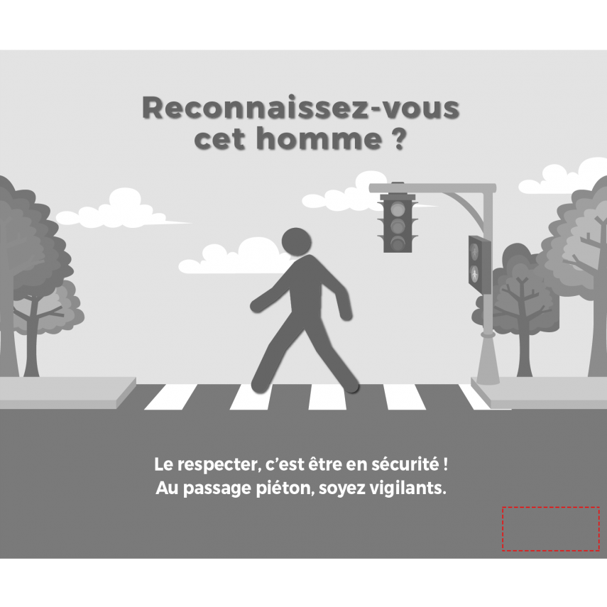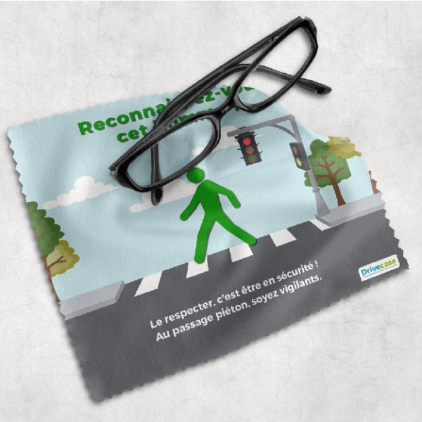 Dieses Brillenputztuch vermittelt eine Verkehrssicherheitsbotschaft. Dieses Modell soll Fußgänger daran erinnern, nicht einfach jederzeit die Straße zu überqueren, aber auch Brillenträger daran erinnern, dass sie ohne ihre Brille in Gefahr sein können.