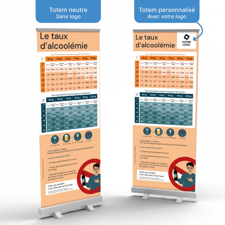 Das Roll-Up-Display „Berechnung des Blutalkoholgehalts” ermöglicht es Ihrem Publikum, seine Alkoholgrenzen vor dem Autofahren anhand verschiedener Faktoren zu berechnen: Geschlecht, Gewicht, nüchtern oder nicht, Anzahl der getrunkenen Gläser. Das Totem bietet auch Informationen über die Zeit, die Alkohol im Blut benötigt, um aufgenommen zu werden, und die Zeit, die benötigt wird, um ihn wieder abzubauen.