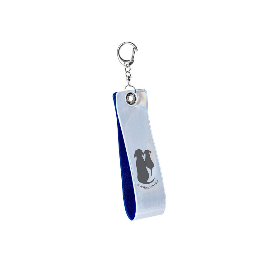 Reflektierender Schlüsselanhänger , vollständig personalisierbar im Vierfarbdruck. Das Band besteht aus einer retroreflektierenden PVC-Folie. Entspricht der Norm EN17353, die eine hohe Lichtreflexionsleistung garantiert.