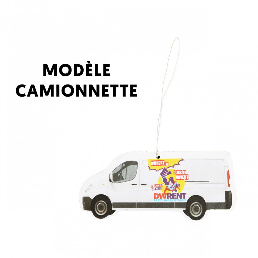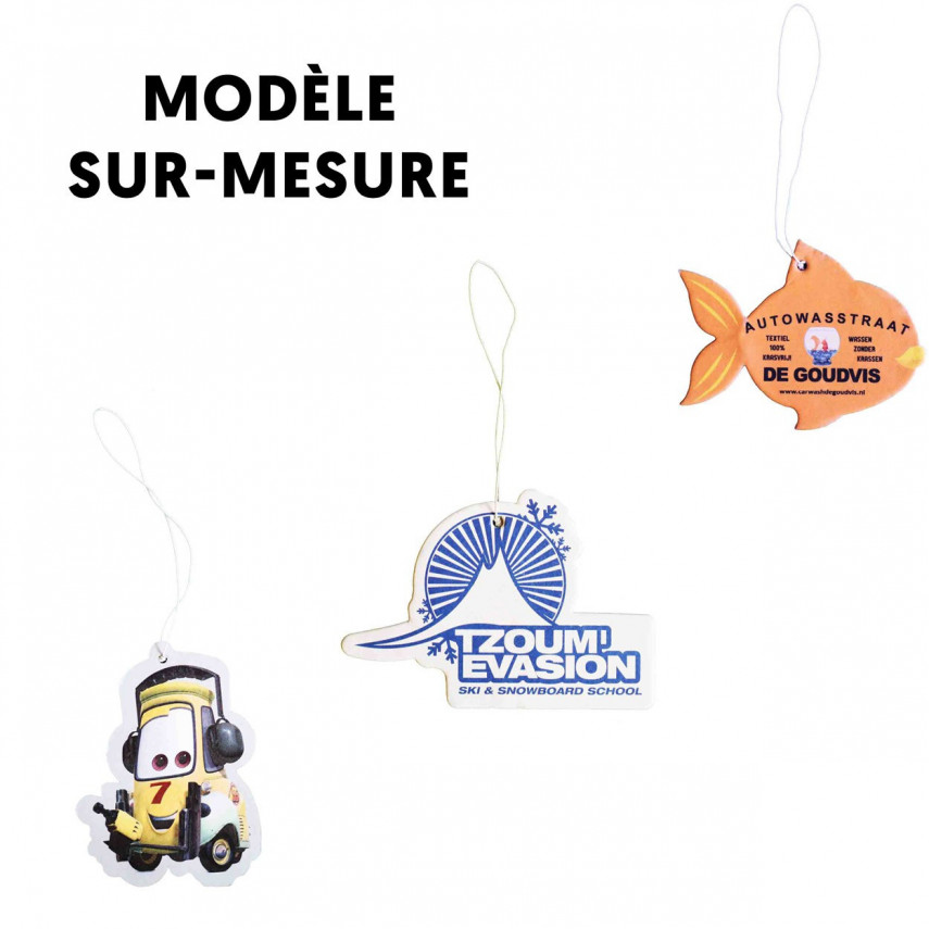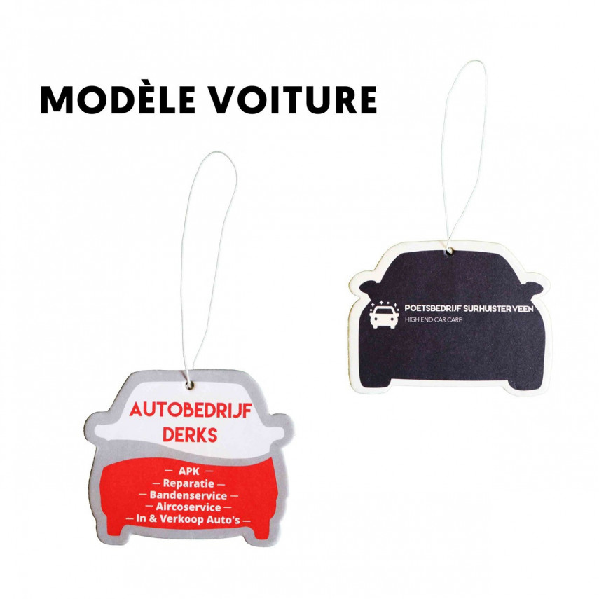 Die Auto-Lufterfrischer sind vollständig personalisierbar und passen sich Ihrer visuellen Identität an. Wir bieten Ihnen verschiedene Modelle personalisierter Auto-Lufterfrischer an: Auto, Lieferwagen, Kreis, Rad und sogar ein maßgeschneidertes Modell, das die von Ihnen gewünschte Form annimmt. Die Personalisierung dieser Lufterfrischer erfolgt durch Vierfarbdruck und ist im Preis inbegriffen. Der Aufdruck erfolgt auf der Vorder- und Rückseite des Lufterfrischers, um eine bessere Sichtbarkeit zu gewährleisten. Es ist möglich, auf der Vorder- und Rückseite unterschiedliche Motive zu wählen. Zögern Sie nicht, uns diesbezüglich zu kontaktieren.