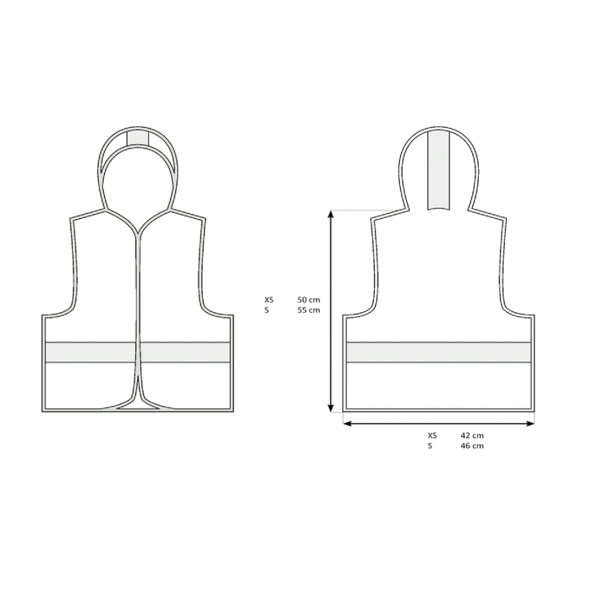 Die Kapuze bietet eine zusätzliche fluoreszierende Fläche, die die Sichtbarkeit von Kindern als Fußgänger oder Radfahrer erheblich erhöht. Die Weste entspricht der Norm EN 17353:2020 und ist mit zwei Reflexstreifen 5 cm: einer am Körper und einer an der Kapuze. Alle Kanten sind ebenfalls mit einem reflektierenden Streifen versehen.