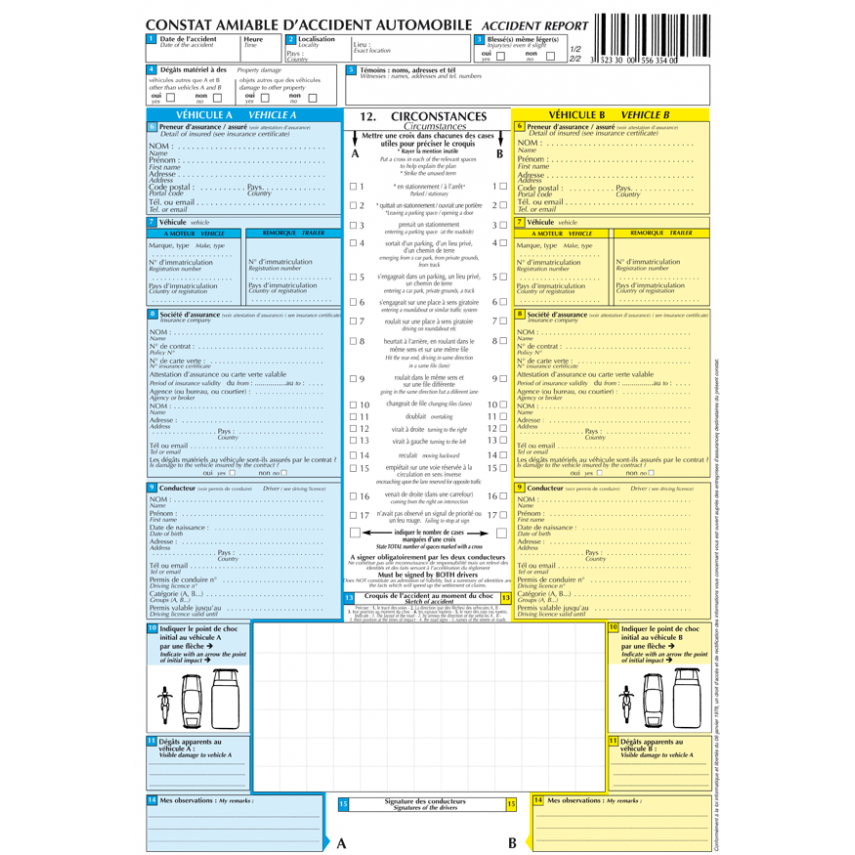 Die Unfallberichte sind offizielle und unwiderrufliche Dokumente. Dieses Dokument dient zur Feststellung der Haftung jedes Fahrers und muss daher klar, lesbar und vollständig sein und die genauen Umstände des Unfalls wiedergeben. Es kann in Frankreich und Europa verwendet werden. Wenn der Unfallbericht korrekt ausgefüllt ist, begrenzen Sie Ihren Haftungsanteil. Es wird dringend empfohlen, einen Unfallbericht im Fahrzeug mitzuführen.