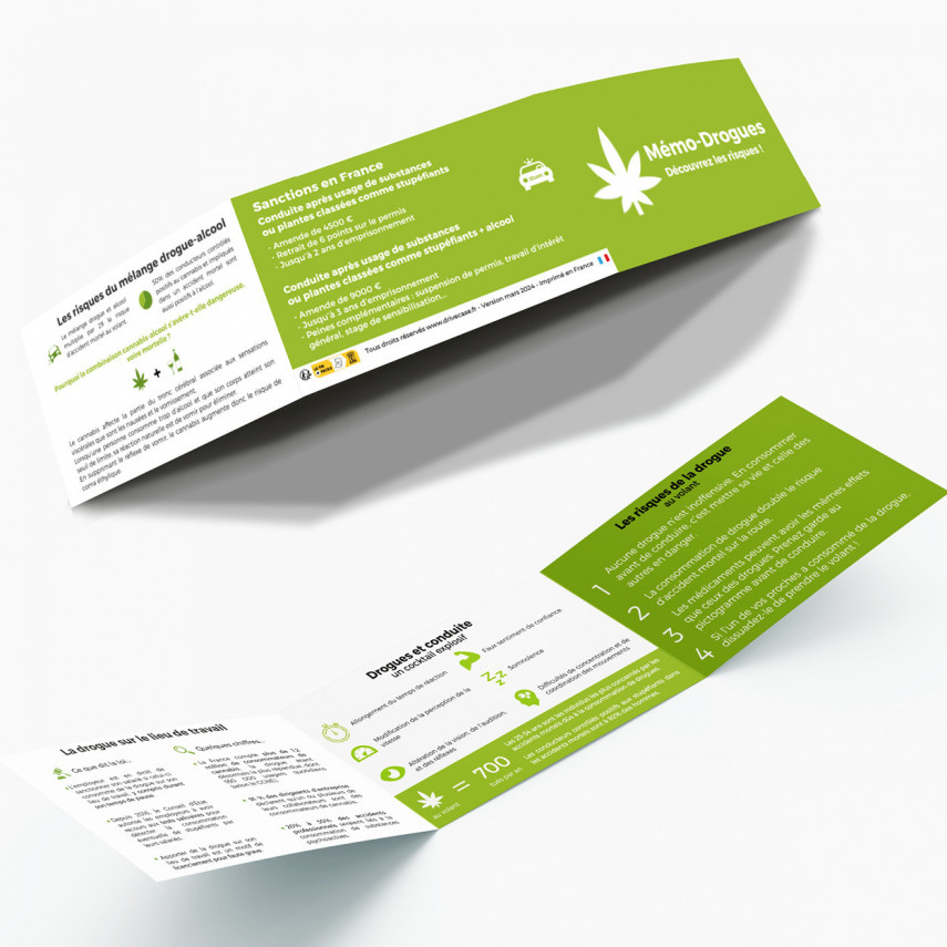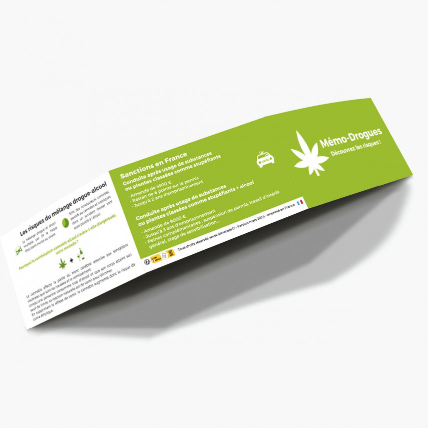 Die Drogen-Memo-Leiste©️ weist auf die Risiken des Drogenkonsums am Arbeitsplatz, vor dem Autofahren und in Verbindung mit Alkohol hin. Sie erinnert auch an die in Frankreich geltenden Strafen.
