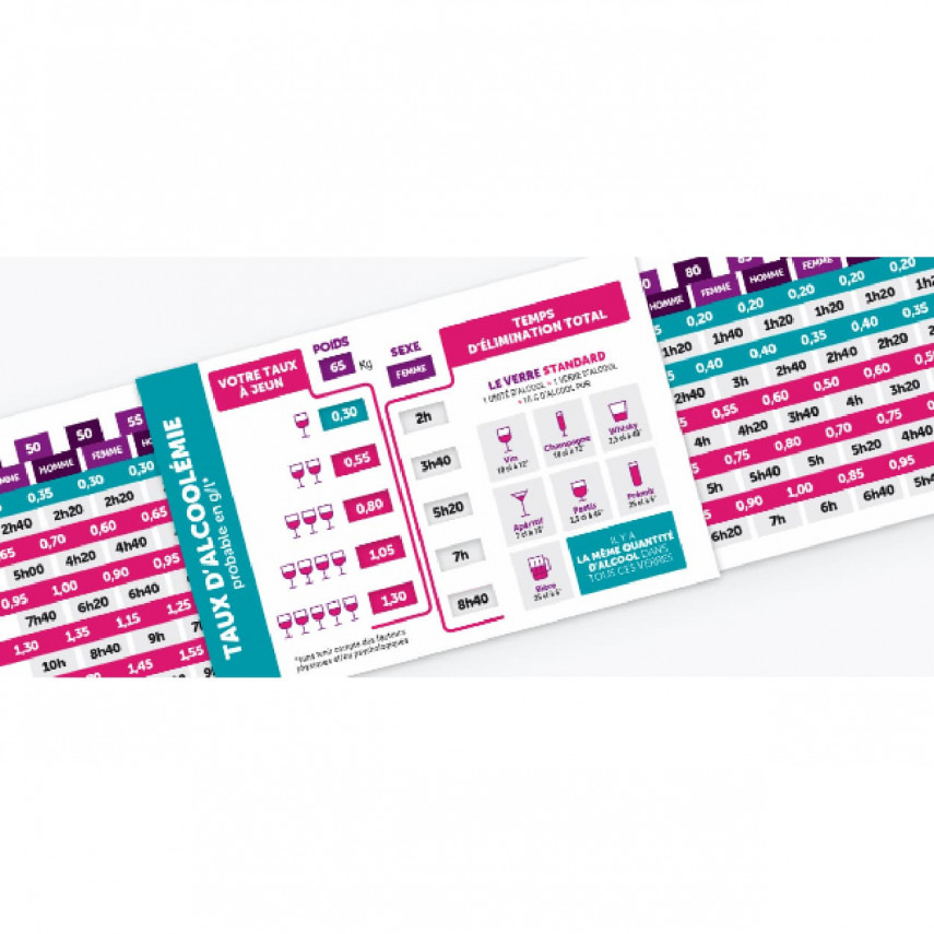 Der praktische und spielerische Alkoholrechner ist ein Kommunikations- und Präventionsmittel, das für alle Zielgruppen nützlich ist. Das Prinzip dieses Sensibilisierungslineals ist sehr einfach: Das Alkohollineal besteht aus zwei Klappklappen im mittleren Teil, zwischen denen ein beweglicher Schieber von links nach rechts verschoben werden kann.