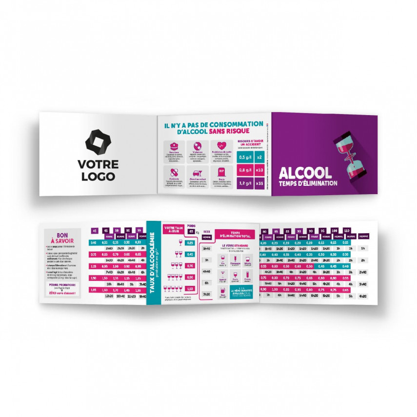 Die in Frankreich gedruckten Alkoholrechner mit individuellem Aufdruck haben eine Lieferzeit von 3 Wochen nach Freigabe des Druckproofs. Fügen Sie Ihr Logo im Format 10 x 6 cm in Vierfarbdruck auf der Innenklappe hinzu. Die Kosten für die Personalisierung entfallen.