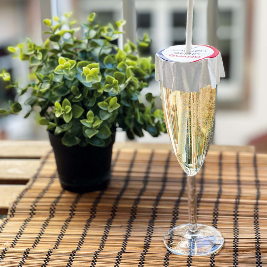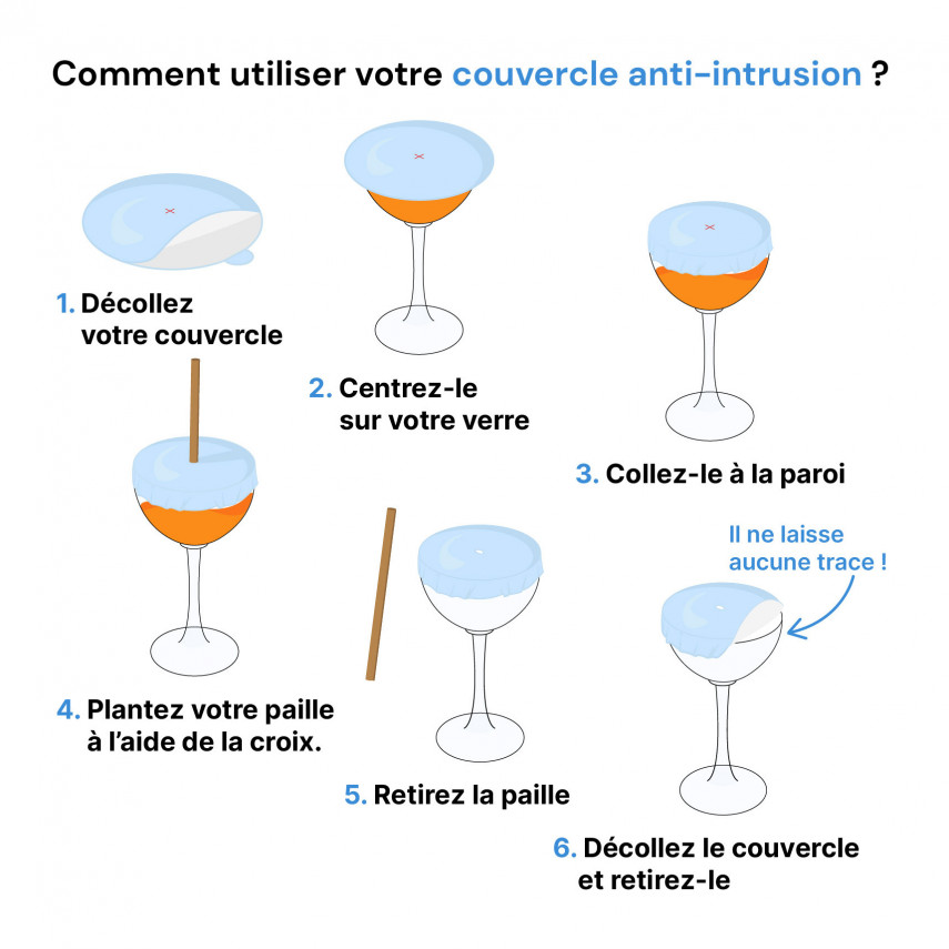 Unsere Anti-Drogen-Glasabdeckung ist zum Einmalgebrauch bestimmt und wird in Form eines zu 100 % recycelbaren Aufklebers geliefert, der sich an alle Arten von Gläsern anpassen lässt, auch an die breitesten. Zur Verwendung kleben Sie den Aufkleber vorsichtig auf die Oberseite des Glases und falten Sie die selbstklebenden Ränder um, um einen optimalen Schutz zu gewährleisten. Um das Einführen eines Strohhalms zu erleichtern, befindet sich in der Mitte der Glasabdeckung eine Mikroperforation.