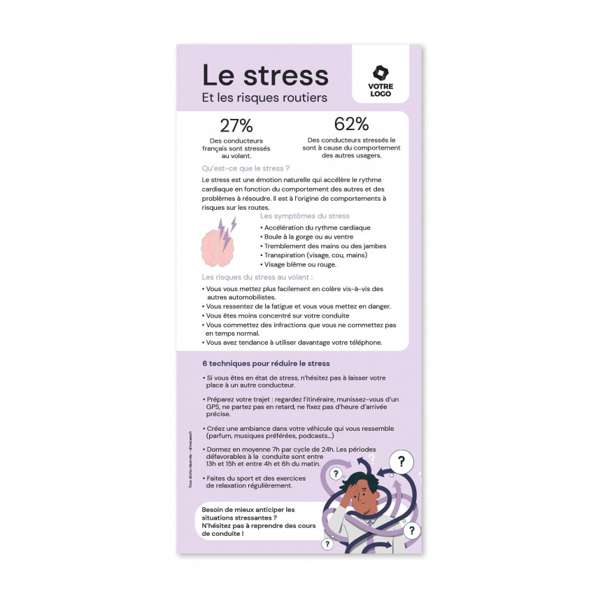Der Sensibilisierungsflyer über die Risiken von Stress am Steuer ermöglicht es Ihnen, Ihre Botschaft nachhaltig zu vermitteln Sensibilisierung Ihrer Mitarbeiter und/oder der breiten Öffentlichkeit zu verbreiten. Er hebt die Symptome des Stresses und stellt fünf Techniken für ein entspannteres Fahren vor.