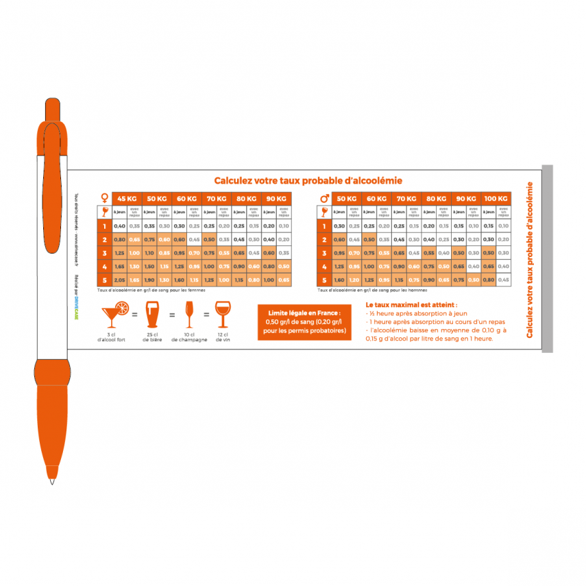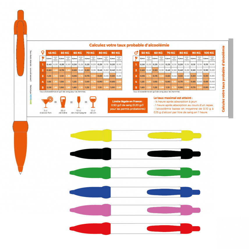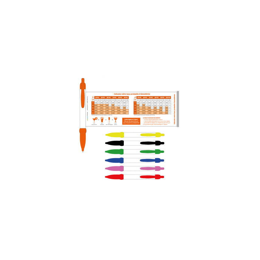 Art.-Nr.P5071Kugelschreiber zu den Gefahren von Alkohol am Steuer und zur Berechnung des Blutalkoholgehalts. Ideales Werbegeschenk, um Ihre Präventionsbotschaft zu verbreiten!