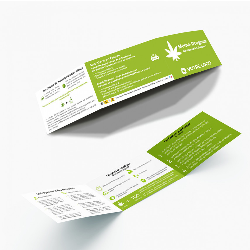 Die Drogen-Memo-Leiste©️ hat das Format einer dreiteiligen Visitenkarte mit vierfarbigem Druck auf 350 g/m² Papier. Format geöffnet: 25,5 x 5,4 cm – Format geschlossen: 8,5 x 5,4 cm. FSC-zertifiziertes Papier.