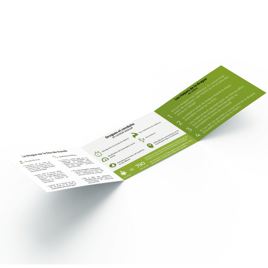 Die Drogen-Memo-Leiste©️ weist auf die Risiken des Drogenkonsums am Arbeitsplatz, vor dem Autofahren oder in Kombination mit Alkohol hin. Sie erinnert auch an die in Frankreich geltenden Strafen.