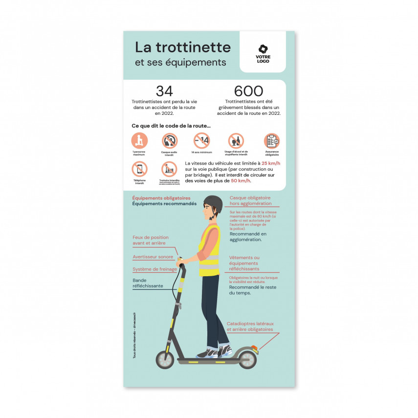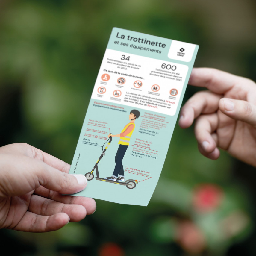 Mit diesem Flyer können Sie über die geltenden Rechtsvorschriften für Elektroroller , sondern auch über die vorgeschriebene oder empfohlene Ausrüstung. Personalisierbar, fügen Sie Ihr Logo oder Ihren Text hinzu.