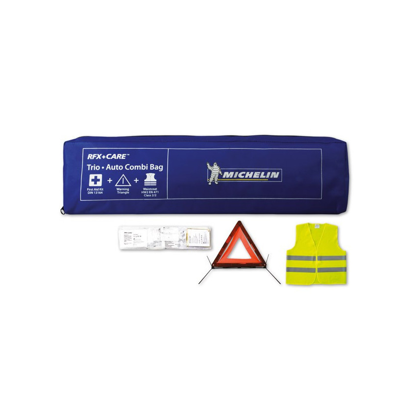 Das 3-teilige Sicherheitsset besteht aus einer Warnweste EN 20471, einem Warndreieck CE E4 27R und Erste-Hilfe-Produkten, die gemäß der Norm DIN 13164 vorgeschrieben sind. Das Set ist in Schwarz, Blau und Rot erhältlich. Ein Klettband auf der Rückseite des Verbandkastens sorgt dafür, dass er am Boden des Fahrzeugs befestigt bleibt.