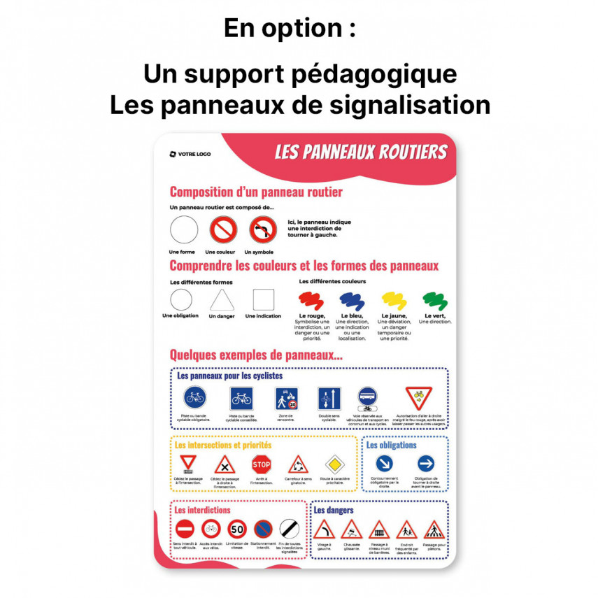 • ein pädagogisches Begleitmaterial zu den Verkehrsschildern. Dieses Begleitmaterial erklärt auf anschauliche und interaktive Weise die Bedeutung der Schilder anhand ihrer Form, ihrer Farbe und der darauf abgebildeten Symbole. Es stellt auch die wichtigsten Schilder vor, die jedes Kind kennen muss, um sich sicher im Straßenverkehr zu bewegen.