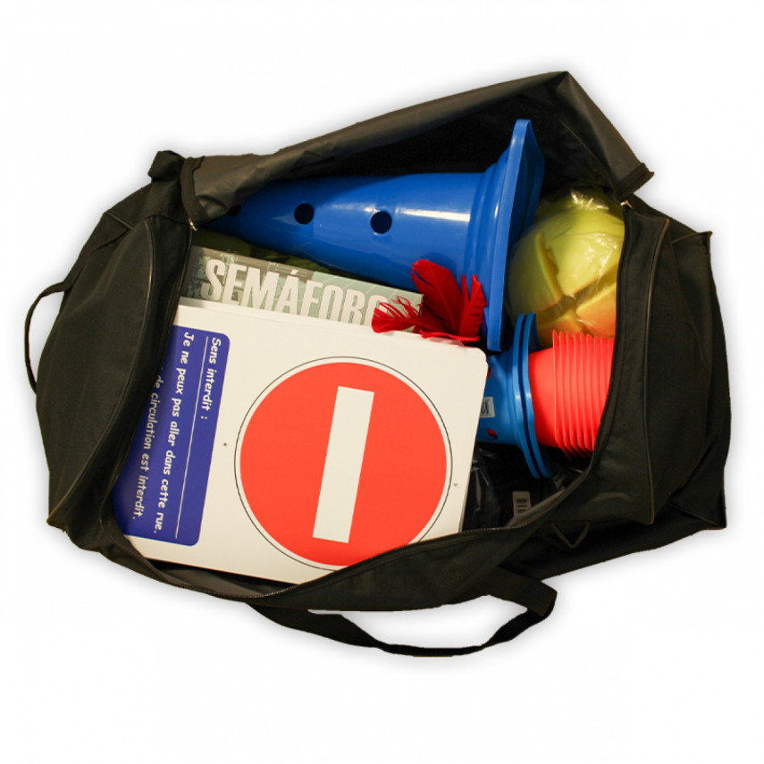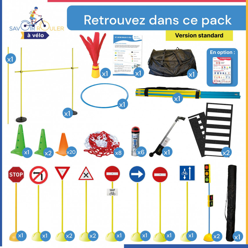 Das Kit Savoir Rouler à Vélo Bloc 2 wurde auf der Grundlage der pädagogischen Ressourcen des Sportministeriums entwickelt. Es enthält die wesentlichen Elemente für die Gestaltung eines Parcours mit Verkehrszeichen, Ampeln, Slalom-Hindernissen, einem Torbogen, einer Bremszone usw.