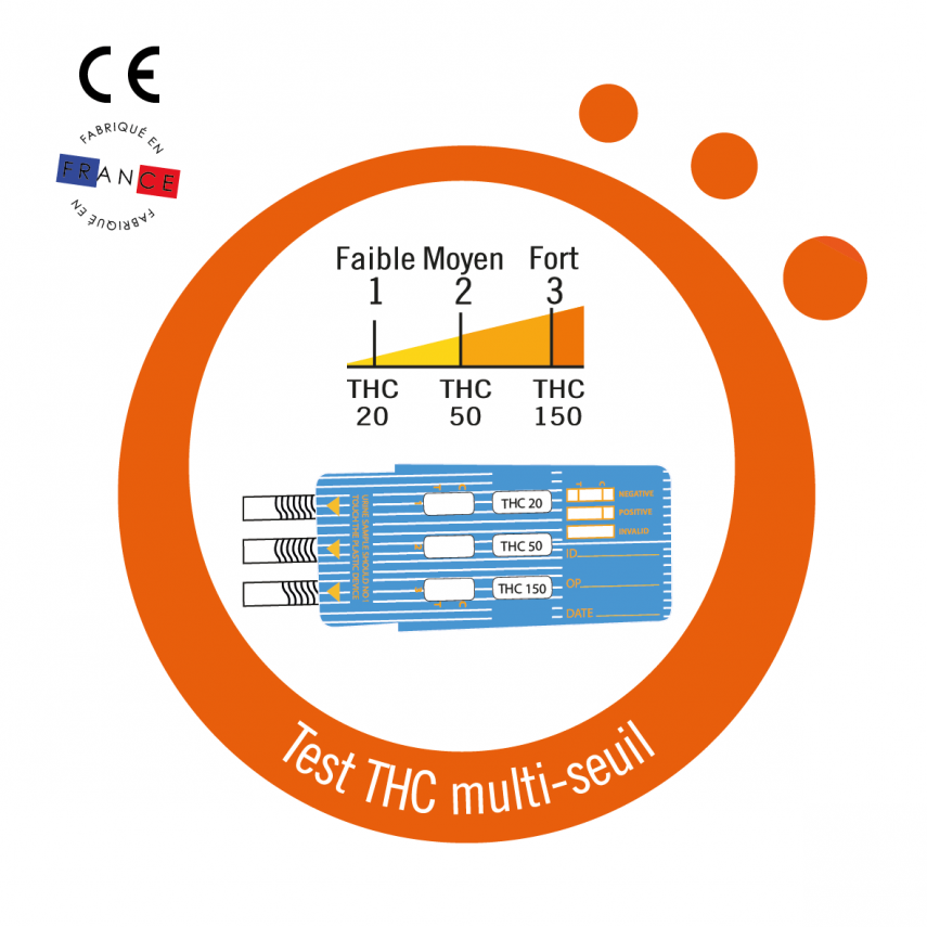 Dieser THC-Urintest ermöglicht den schnellen Nachweis einer niedrigen (20 ng/ml), mittleren (50 ng/ml) oder hohen (150 ng/ml) THC-Konzentration (Cannabis), was die Auswertung der Ergebnisse und die Überwachung des Konsums oder Entzugs erleichtert. Die Anwendung ist sehr einfach und dauert nicht länger als eine Minute. Die Ergebnisse liegen nach 5 Minuten vor.