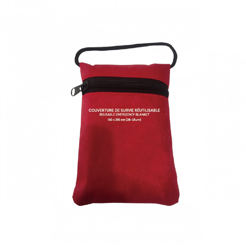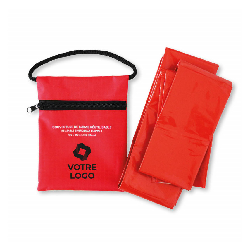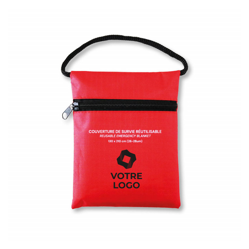 Die rote Hülle aus Polyester ist robust und dient zur Aufbewahrung der Rettungsdecke bis zum nächsten Einsatz. Sie bietet auch eine schöne Fläche für eine Beschriftung: Sie können Ihr Logo oder Ihre Werbebotschaft hinzufügen, um die Sichtbarkeit zu erhöhen!