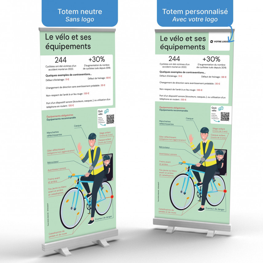 Art.-Nr.P9605Roll-up-Totem zur Sensibilisierung für Risiken beim Radfahren Ideal, um Zahlen zur Verkehrssicherheit zu kommunizieren und Ihr Publikum an die obligatorischen Ausrüstungsgegenstände und empfohlenen Ausrüstungsgegenstände für Radfahrer. Der Druck ist mit dem Green R-Label gekennzeichnet.