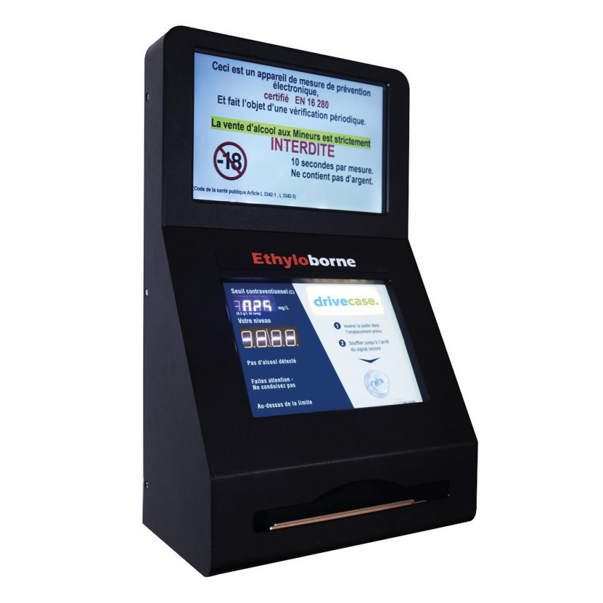 Ref.P9547La borne ethylotest Ethyl-ia allie prévention et innovation. Conçue pour bars et lieux festifs, elle mesure l’alcoolémie avec précision grâce à un éthylotest homologué. Facile à personnaliser, elle sensibilise vos clients tout en collectant des données statistiques, renforçant votre engagement pour une consommation responsable et la sécurité routière.