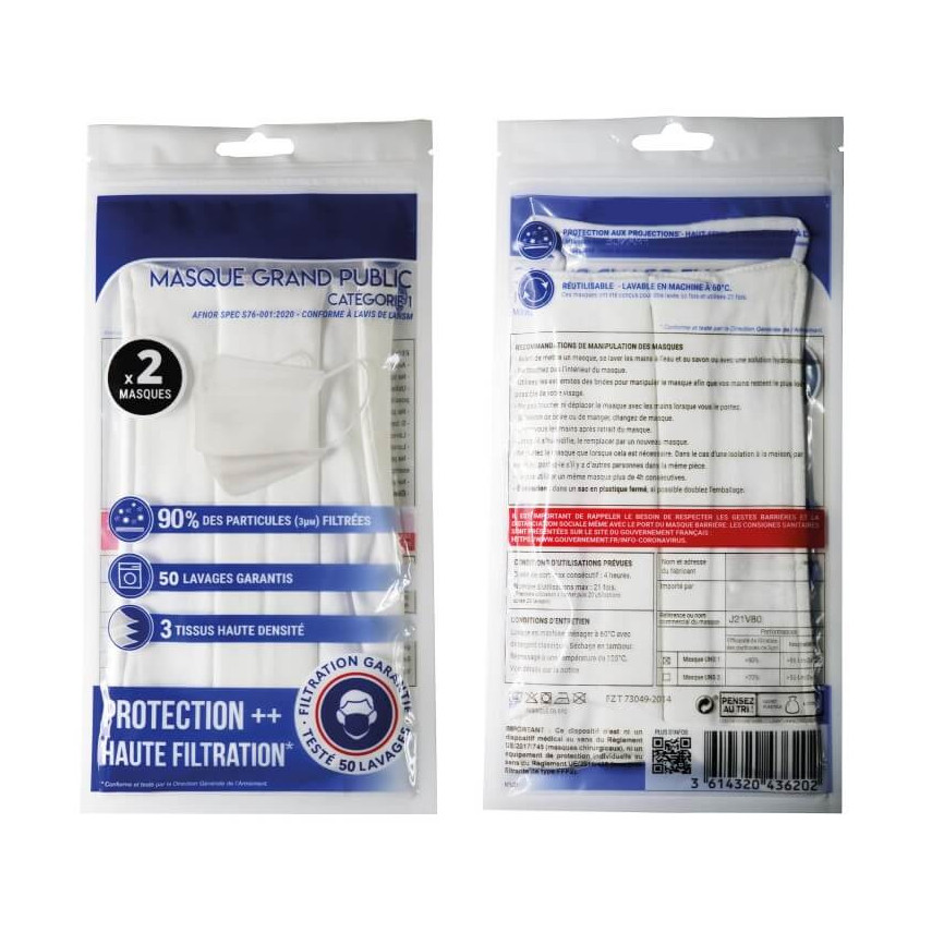 - Emballé par sachet de 2 masques avec une notice d’utilisation en français