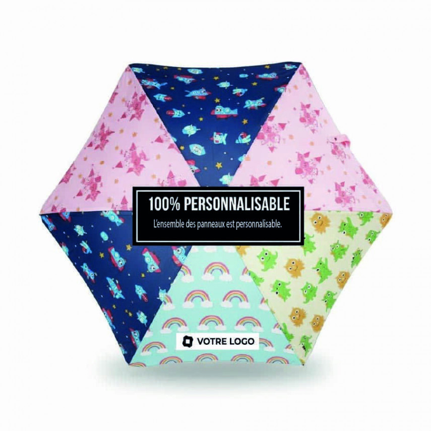 Le Parapluie enfant à bandes réfléchissantes est adapté aux enfants, il se personnalise entièrement sur tous les panneaux extérieurs avec vos visuels, logos ou motifs, pour un rendu unique et coloré. Les bandes réfléchissantes captent la lumière pour que le parapluie se remarque mieux.